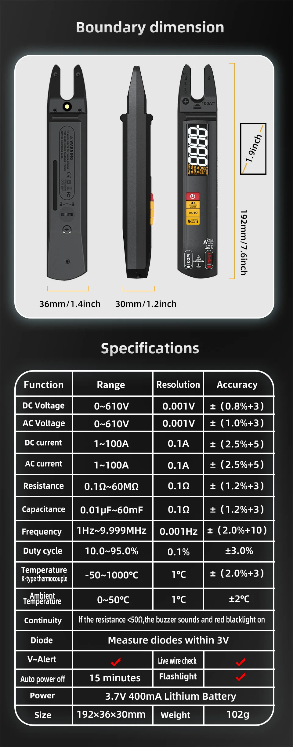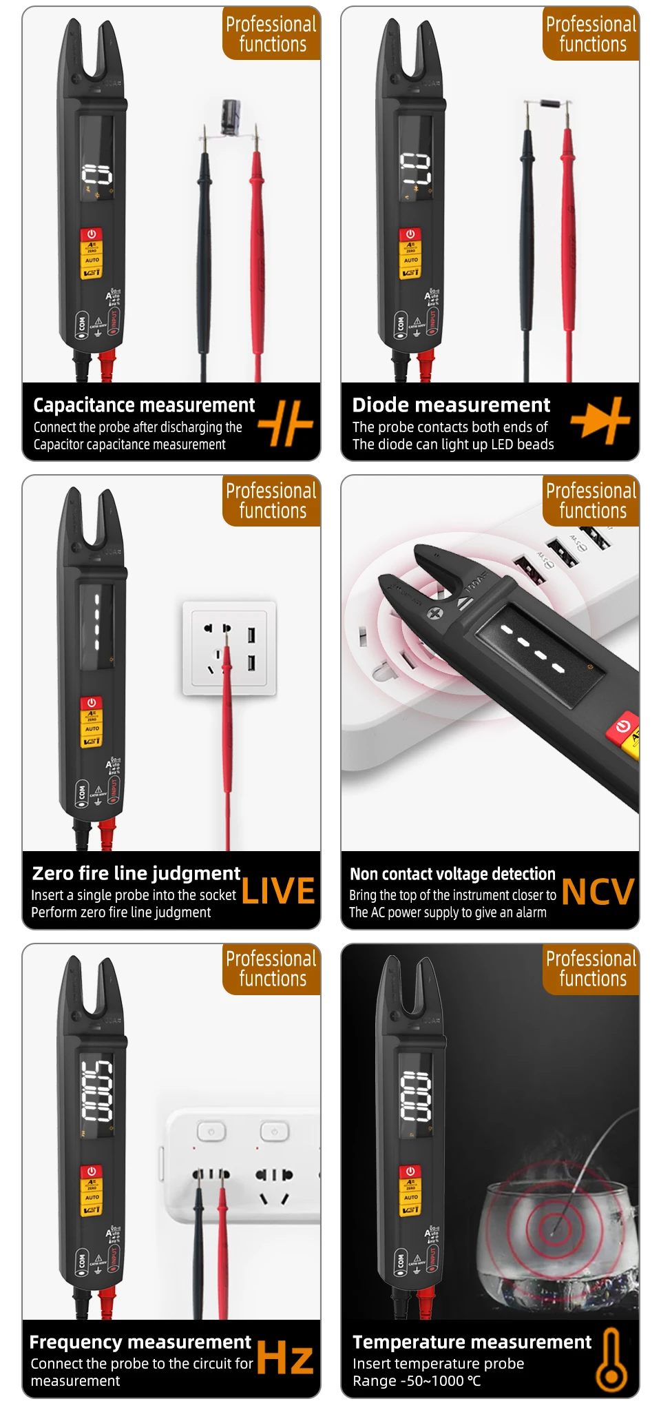 6. Multimeter function supports voltage, resistance, on/off, diode, capacitance, frequency, duty cycle, temperature